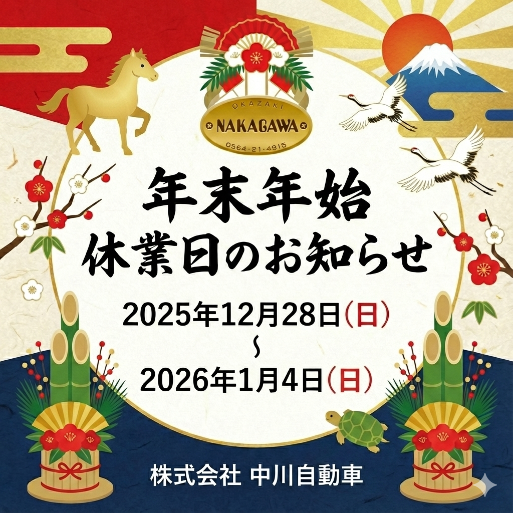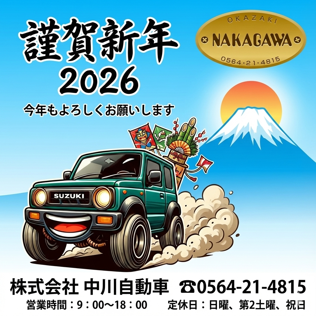 2026/01/01 2026年 あけましておめでとうございます ご案内 あけましておめでとうございます。 2026年も中川自動車をよろしくお願いいたします。 1月5日より営業いたします。 本年もたくさんのみなさまのご来店、お待ちしております。
