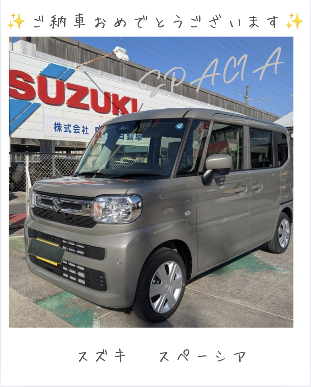 2026/01/19 2026年 第1号車 納車 納車情報 2026年 第1号車 納車させていただきました。スペーシアです! 既存のお客様からご親族をご紹介いただきました。ご紹介というのは、当社を信頼いただいている証ですので嬉しいですね。最近このモスグレーが、車種問わずよく売れています。老若男女問わず好かれる色なので、親子共用の車などには最適です。A様、この度は当社にてご購入いただき、ありがとうございました。これから末永くご愛顧よろしくお願いいたします