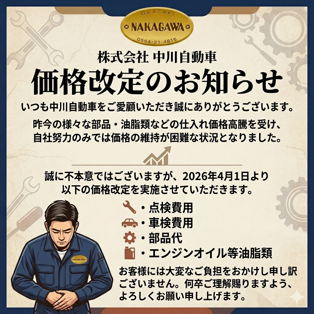 2026/03/31 【苦渋の決断です】価格改定のお知らせ いつも中川自動車をご愛顧いただき、誠にありがとうございます。 昨今の様々な部品・油脂類などの仕入れ価格高騰を受け、自社努力のみでは価格の維持が困難な状況となりました。 誠に不本意ではございますが、4月1日より以下の価格改定(値上げ)を実施させていただきます。 お客様には大変なご負担をおかけし申し訳ございません。 何卒ご理解賜りますよう、よろしくお願い申し上げます。