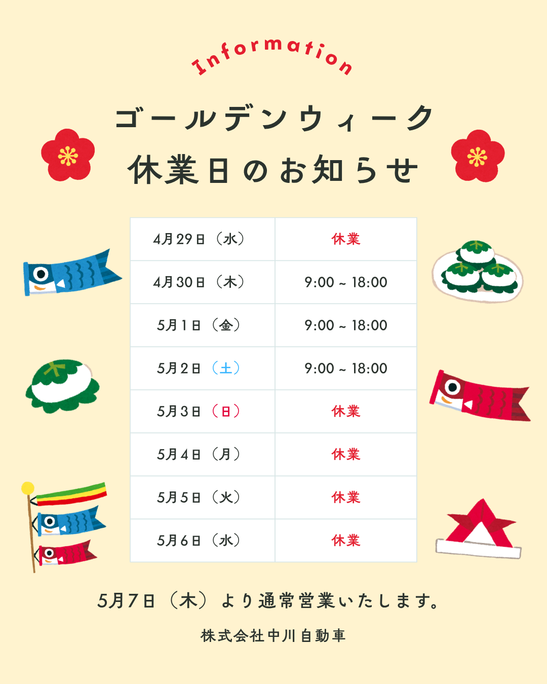 2026/04/28 【今年は短い連休】GW休業日のお知らせ ご案内 今年は4連休です。 営業日もご予約がいくつか入ってはいますが、まだ少し余裕がありますので、 ご相談事がある方はお電話ください。 29日以降は部品が入ってこないので、部品交換の必要な修理は後日にさせて いただきますこと、ご了承ください。 それでは皆様、良いゴールデンウイークを!